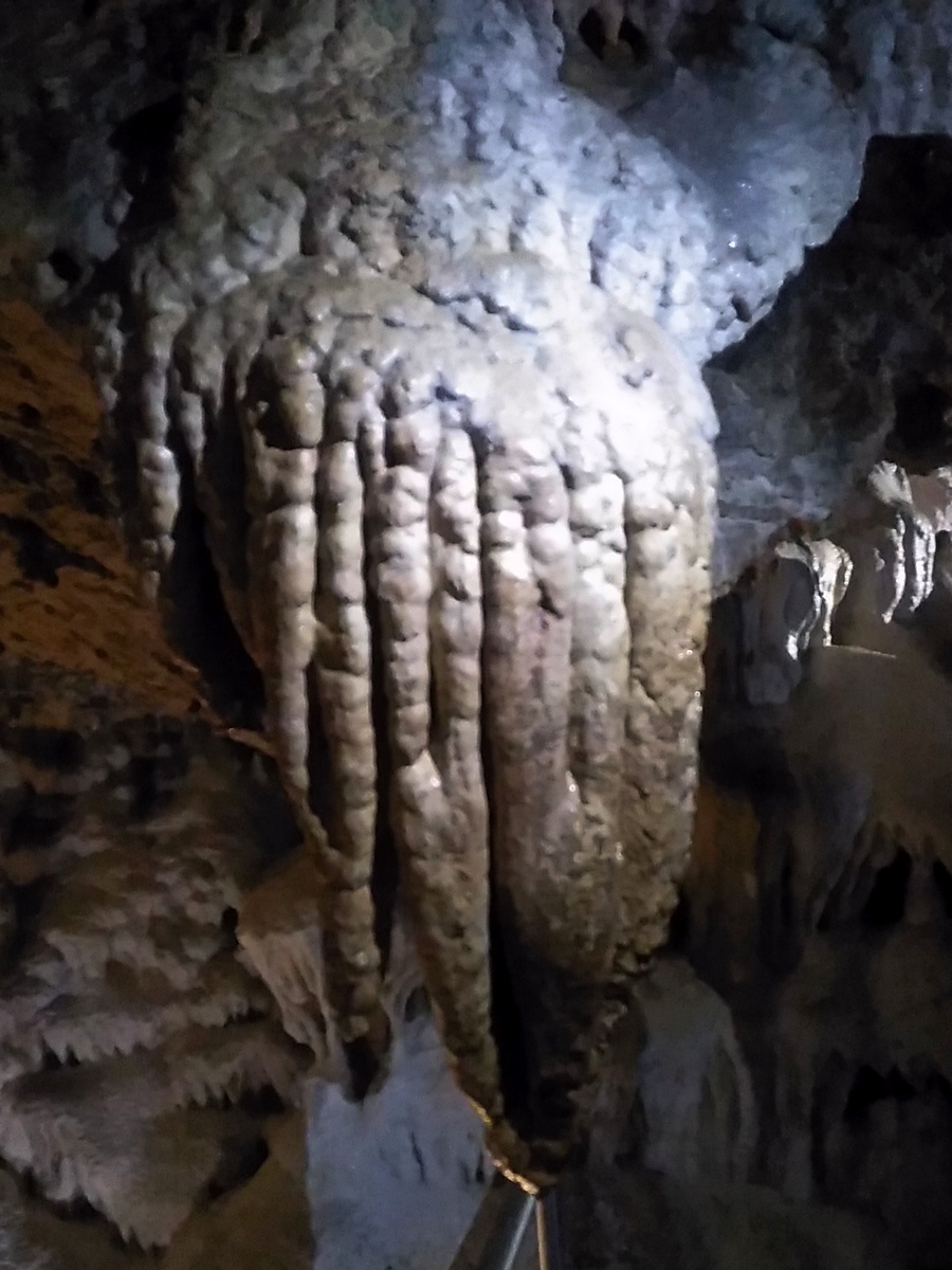 Po jaskini poruszaliśmy trasą turystyczną po wybetonowanych chodnikach i 866 schodach. Trasa poprowadzona jest przez mniej więcej jedną trzecią korytarzy jaskini (długość trasy to 1370 m, a całkowita długość zmierzonych dotychczas korytarz to 3829 m). Do pozostałej części wstęp mają tylko grotołazi. Temperatura w jaskini oscyluje wokół 5 stopni Celsjusza, przydały się więc dodatkowe, wpakowane do plecaka na tzw. „wszelki wypadek” kurtki.