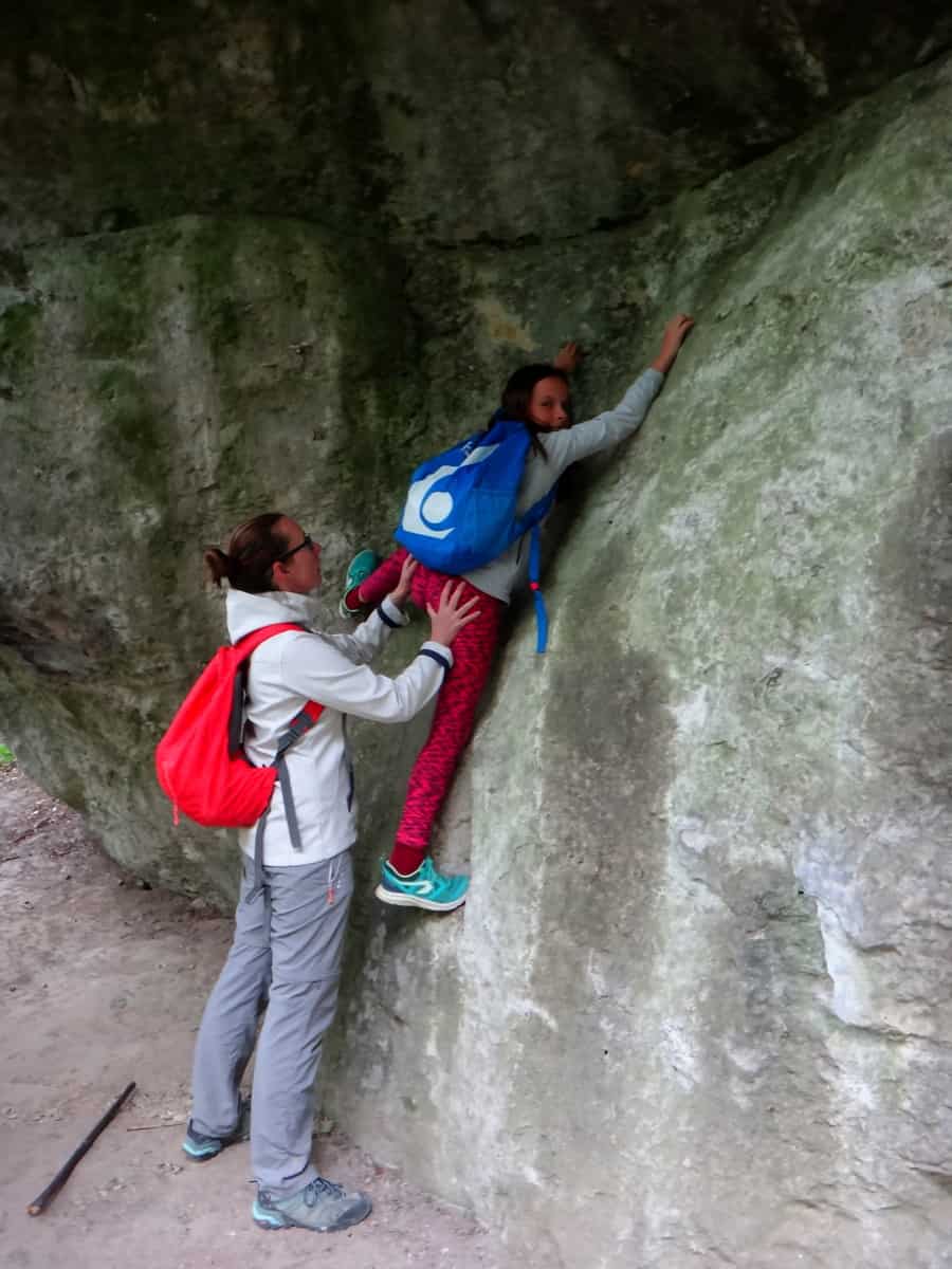W rezerwacie spotkaliśmy tyko dwóch amatorów boulderingu, dla których tutejsze skałki są nie lada wyzwaniem i atrakcją. Ania i Janek też chcieli pójść w ich ślady, ale okazało się to wcale nie takie proste 🙂 .