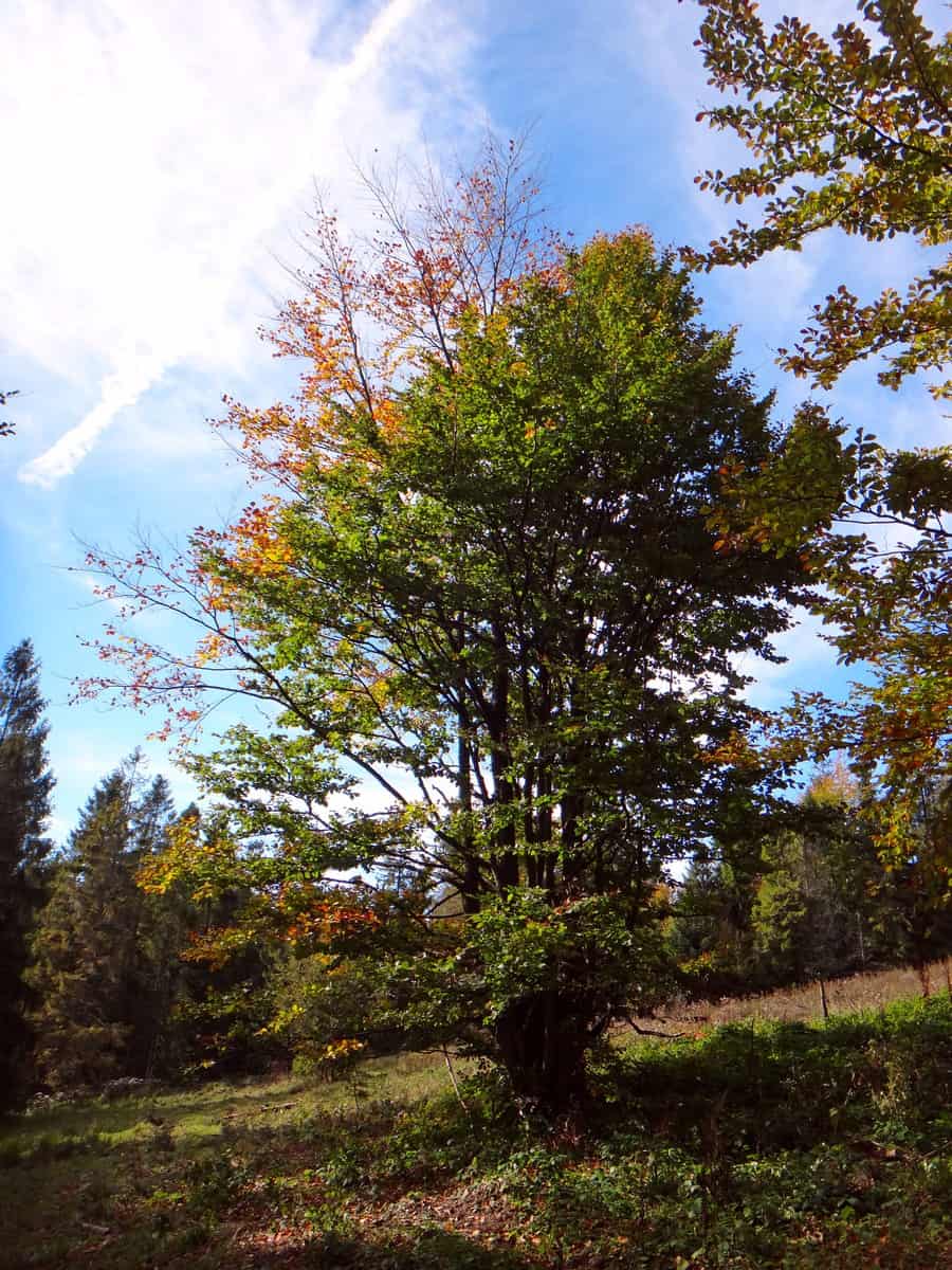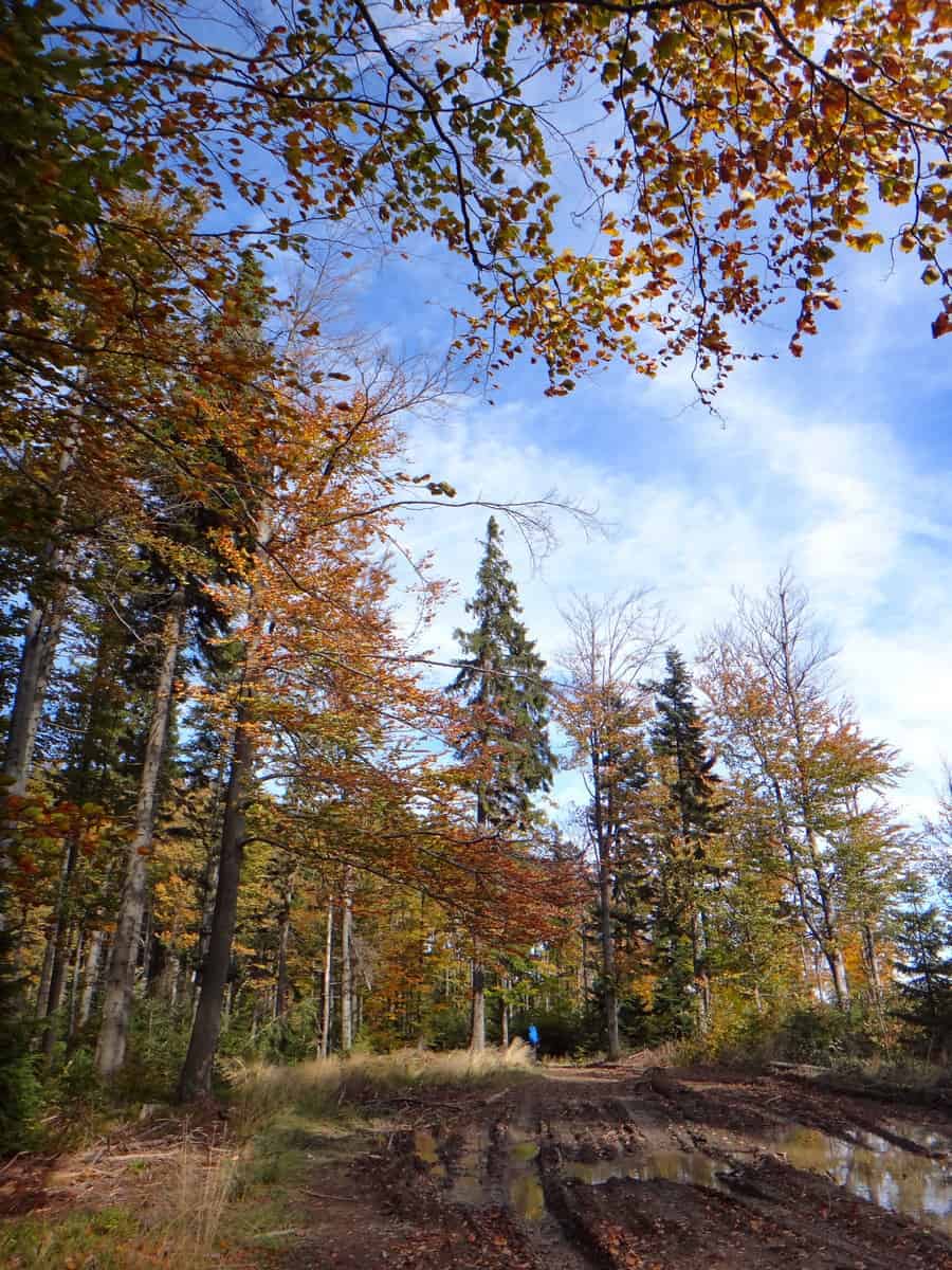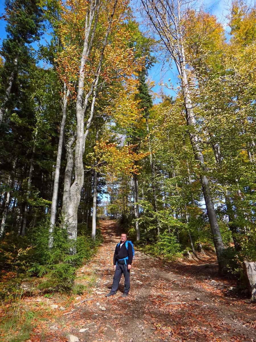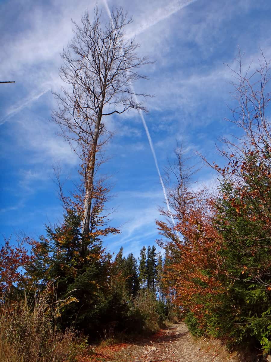 Wyruszyliśmy zielonym szlakiem spod Domu Wczasów Dziecięcych w Sidzinie. Pogoda rozpieszczała. Jesienna wędrówka przez pasmo Polic na Halę Krupową pośród zielono-złotych drzew, szeleszczących, suchych liści i spłowiałych traw zajęła nam około dwóch godzin.