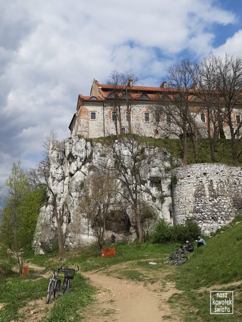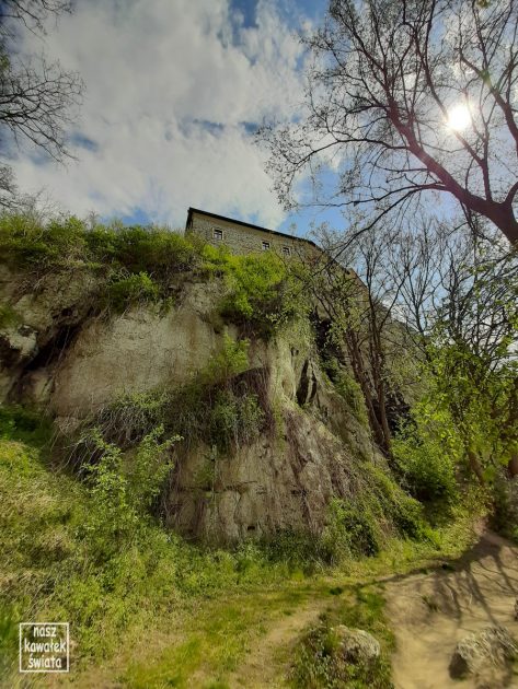 Z perspektywy Skałek Piekarskich nie „czuje się” majestatu kamiennej ściany, na której położony jest klasztor. Tym razem, stojąc u stóp opactwa, musieliśmy dobrze zadzierać głowy, by dostrzec jego zabudowania na wapiennej skarpie.