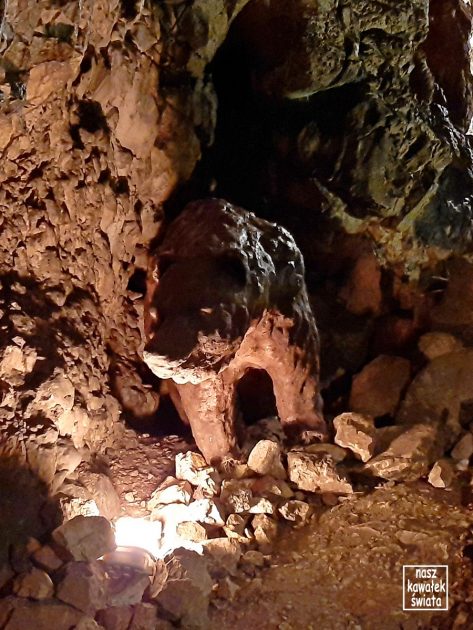 W zakamarkach Przesmyku Długiego i Hali z Kotłami dostrzegliśmy figury pradawnych zwierząt, których kości odnaleziono w namulisku jaskini (niedźwiedź jaskiniowy, hiena, jaskiniowa, lew).